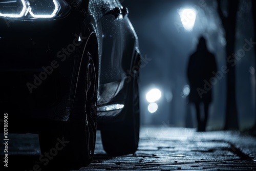 A hidden camera recording a suspicious individual tampering with a parked car under dim streetlights