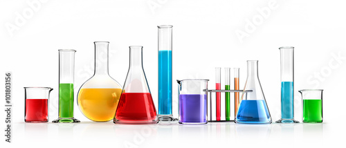 Farbige Chemiegläser in Reihe