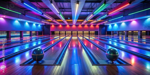 Night shot, bowling alley, colorful lights, illuminated building
