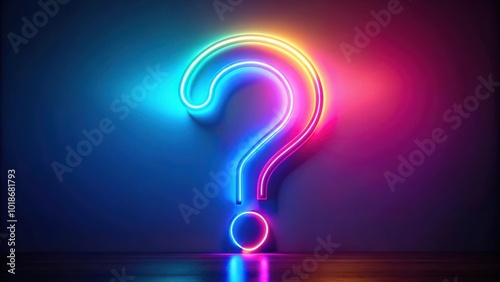 Vibrant neon glowing question mark suspended in mid air with colorful lights