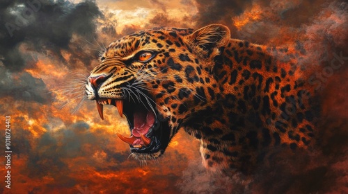 A leopard with its mouth open and teeth bared. The leopard is surrounded by a fiery orange background