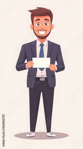 A cartoon man in a suit and tie, wearing white socks on his feet, is holding up an empty card to the camera