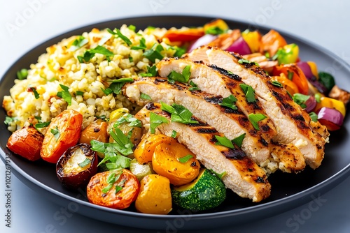 A plate of cauliflower rice with roasted vegetables and grilled chicken, showing a typical low-carb meal substitution