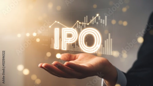 A business professional holding a glowing 'IPO' sign with financial charts. Ideal for investment, finance, and business growth concepts, emphasizing initial public offerings.