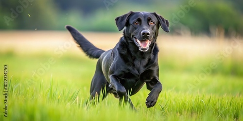 Black labrador retriever running in a grassy field, dog, black lab, retriever, pet, animal, obedient, energetic, playful