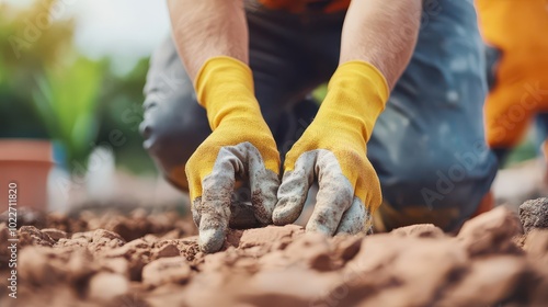 A close-up of a gardener's hands wearing yellow gloves, planting seeds in rich soil, capturing the essence of planting and nurturing.