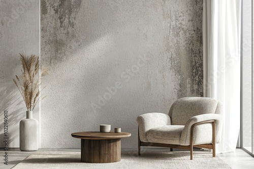 modern living room with an armchair and coffee table against the background of a blank wall for mockups, a minimalistic interior design concept. Web banner with copy space