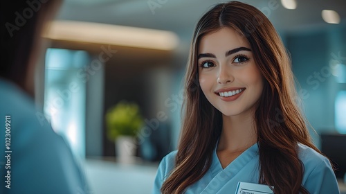 recepcjonistka, medyczne centrum, kobieta, brązowe włosy, uniform, recepcja, stock photo, Canon EOS R3, przysłona f/1.8, profesjonalna fotografia, uśmiech, europejka, pracownica, biuro, pomoc, medycyn