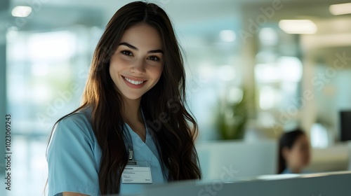 recepcjonistka, medyczne centrum, kobieta, brązowe włosy, uniform, recepcja, stock photo, Canon EOS R3, przysłona f/1.8, profesjonalna fotografia, uśmiech, europejka, pracownica, biuro, pomoc, medycyn