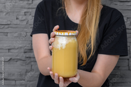 Kobieta trzyma w rękach słoik z skrystalizowanym miodem pszczelim,