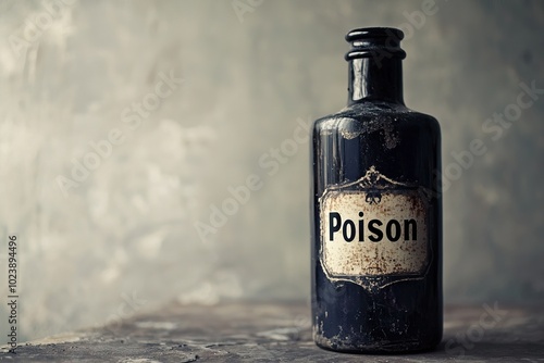 old dark glass bottle with label poison on grey concrete wall background with copy space