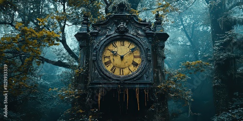 large antique clock hangs in forest, with its face and hands melting like wax over tree branches, creating surreal, dreamlike imagery.
