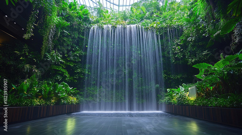 A waterfall is in a lush green garden. The water is falling from a large rock and is surrounded by plants. The scene is peaceful and serene
