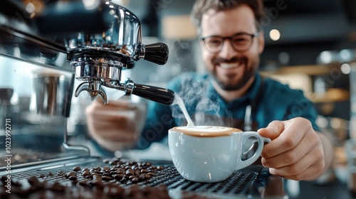 A joyful barista uses an espresso machine to prepare a cappuccino, combining skill and warmth in a buzzing cafe, showcasing the craft of coffee creation.