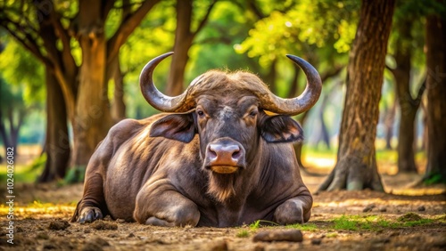 Tired buffalo with sawn-off horn resting in shade of trees, buffalo, animal, tired, horn, sawn-off, shade, trees, nature