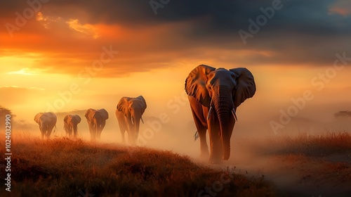A herd of majestic elephants slowly making their way across the vast dusty expanse of the African savannah The pachyderms move in unison