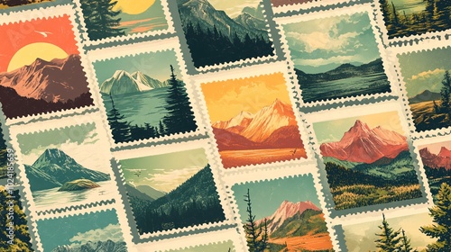 2410_040.retro philatelic landscape series, simplified natural elements, warm and cool color contrasts, stylized environmental illustrations, iconic travel motifs, vintage poster art influence,