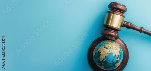 Gavel resting on earth globe against blue background symbolizing global justice and law. Human Rights Week banner