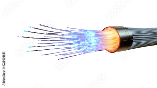 3d rendering of a fiber optic cable bursting with data, transmitting light pulses as a representation of high-speed internet. Ideal for communication and technology-themed projects