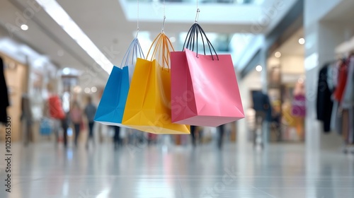 Colorful shopping bags dangle in a bustling mall, showcasing the excitement of retail therapy. Motion blur adds a sense of energy and movement, capturing the fast-paced atmosphere of the shopping exp