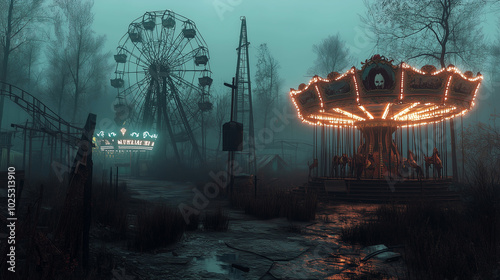 An abandoned carnival at night, with broken rides, eerie clowns, and a ghostly figure standing near a flickering carousel.