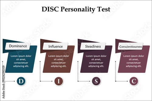 DISC Personality Test - Dominance, Influence, Steadiness, Conscientiousness. Infographic template with icons and description placeholder