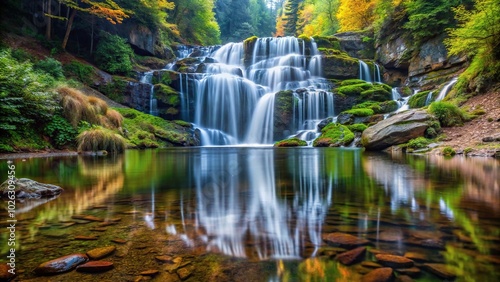 Mountain landscape with a reflective waterfall in the Huk Zhenetskyi Carpathians