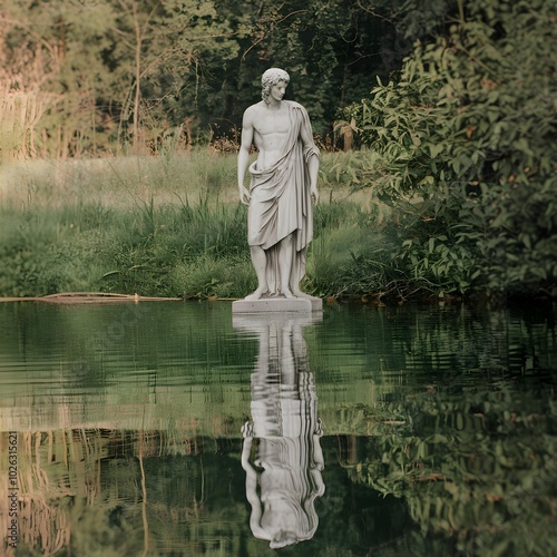 une statue de Narcisse, une figure mythologique grecque, debout à côté d’un plan d’eau.ce qui fait référence au mythe de Narcisse, connu pour sa beauté et son obsession pour son propre reflet