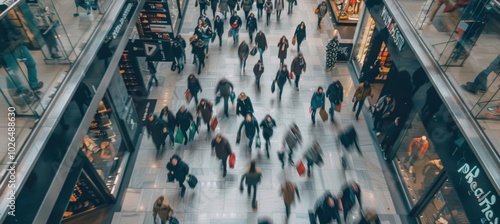 Dynamic Overhead View of a Vibrant Shopping Mall During Black Friday Sales Blitz