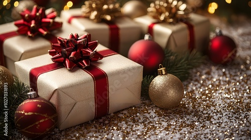 Seamless pattern of New Year presents with glittering confetti and ribbons