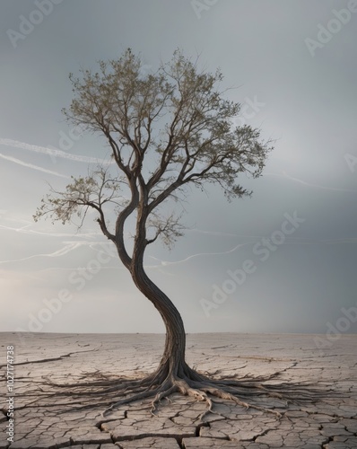 A solitary tree stands resilient on cracked earth under cloudy skies.