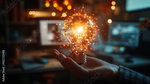 W skupieniu nad swoją pracą, biznesmen trzyma w dłoni mały, lśniącą żarówkę, symbolizujący nową, innowacyjną ideę.