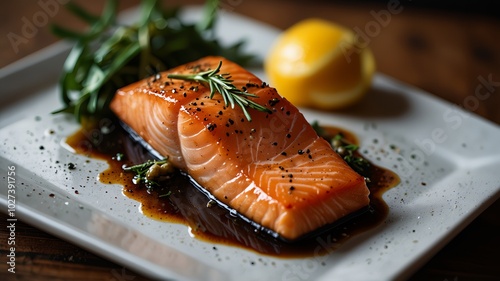 kawałek łososia na białym talerzu z gałązką rozmarynu, łosoś, łosoś khoshroo, pyszne jedzenie