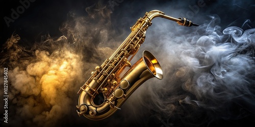 saxophone, instrument, band, golden, captivating, shiny, music, melody, Golden shiny alto saxophone with a black background and smoke creating a captivating and atmospheric image