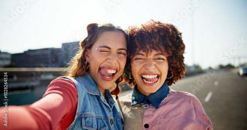 Outdoor selfie, people and goofy portrait in city, photography and confident for street fashion. Women, friends and tongue out for comedy in relationship, gen z style and social media post on weekend