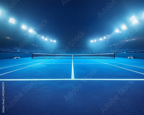 A vibrant blue tennis court illuminated by floodlights, creating an intense and dramatic atmosphere at night.