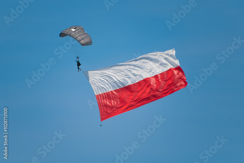 A paratrooper in the sky with the Polish flag. Warsaw, Poland.