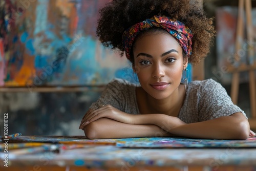 Female painter contemplating creative ideas for her new art project, Generative AI