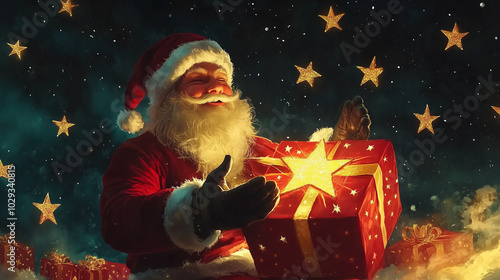 Święty Mikołaj, który z radością otwiera pięknie zapakowany prezent, z którego wyłaniają się błyszczące złote gwiazdki.