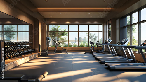 A high-end five-star hotel fitness center with state-of-the-art equipment and large windows.