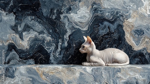 A Sphydrah cat sits on a ledge in front of a blue-and-white marble wall