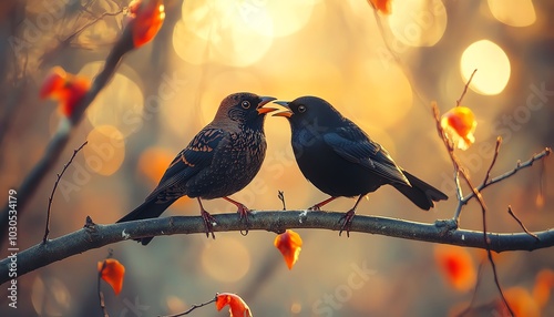 Pair of blackbirds, male and female, perched closely on a tree branch in a forest, showcasing avian behavior against a sunlit bokeh background