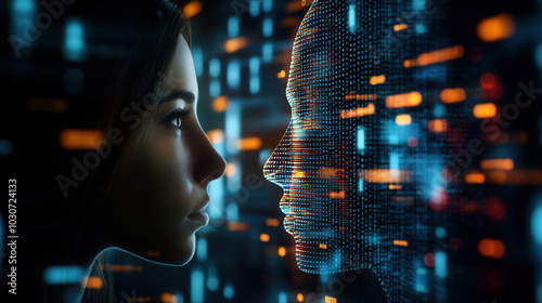 human silhouette interacts with digital representation, surrounded by glowing data streams. scene evokes sense of connection between humanity and technology