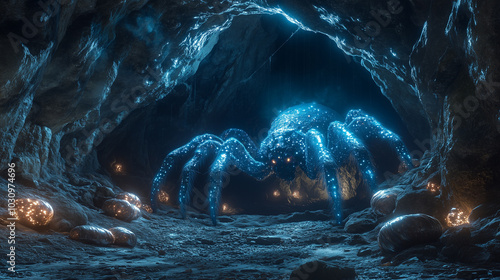 In a dark cave, a massive blue spider with glowing features stands out, surrounded by sparkling crystals