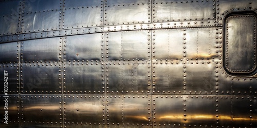 Metallic old airplane fuselage with rivets, showcasing a military background, aircraft, aviation, vintage
