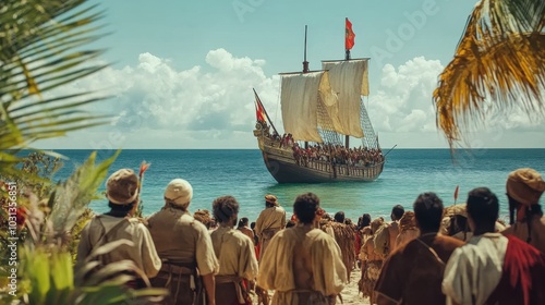 Historical reenactment of Columbus's arrival in the New World and his first encounter with indigenous people on the shore