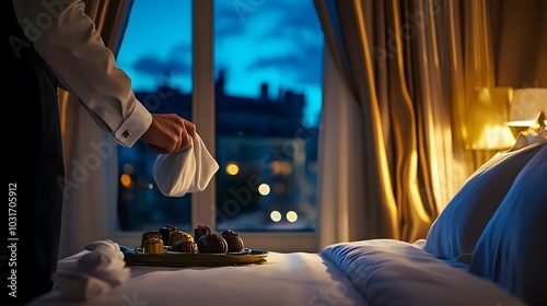 Luxury Hotel Turndown Service with Elegant Chocolates and Stunning Night View