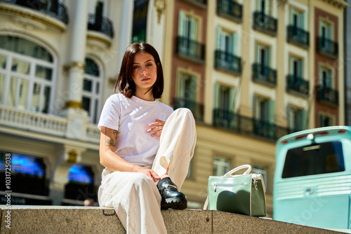 Young woman sitting on a stone ledge in a city street, looking forward with a calm expression, and a green handbag beside her.