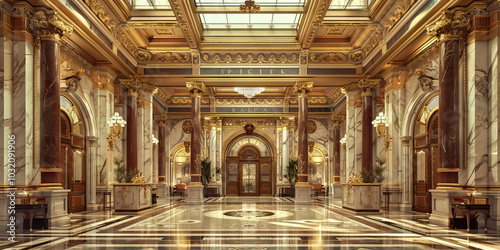 The glamorous art deco details of an old-world European bank, with its gleaming brass fixtures, ornate ceilings, and luxurious marble surfaces.
