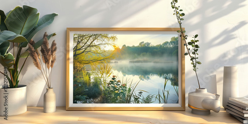A framed photograph of a serene nature scene, intended to evoke a sense of peace and well-being in a therapy room.